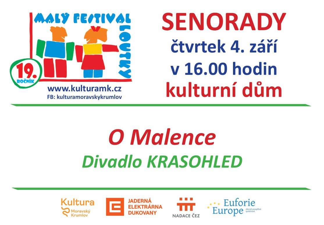 Obec Senorady ve spolupráci s Kultura Moravský Krumlov, p.o. srdečně zve všechny děti, rodiče i prarodiče na divadelní představení divadla Krasohled - O Malence. Představení se uskuteční ve čtvrtek 4.září od 16:00 hodin v kulturním domě.