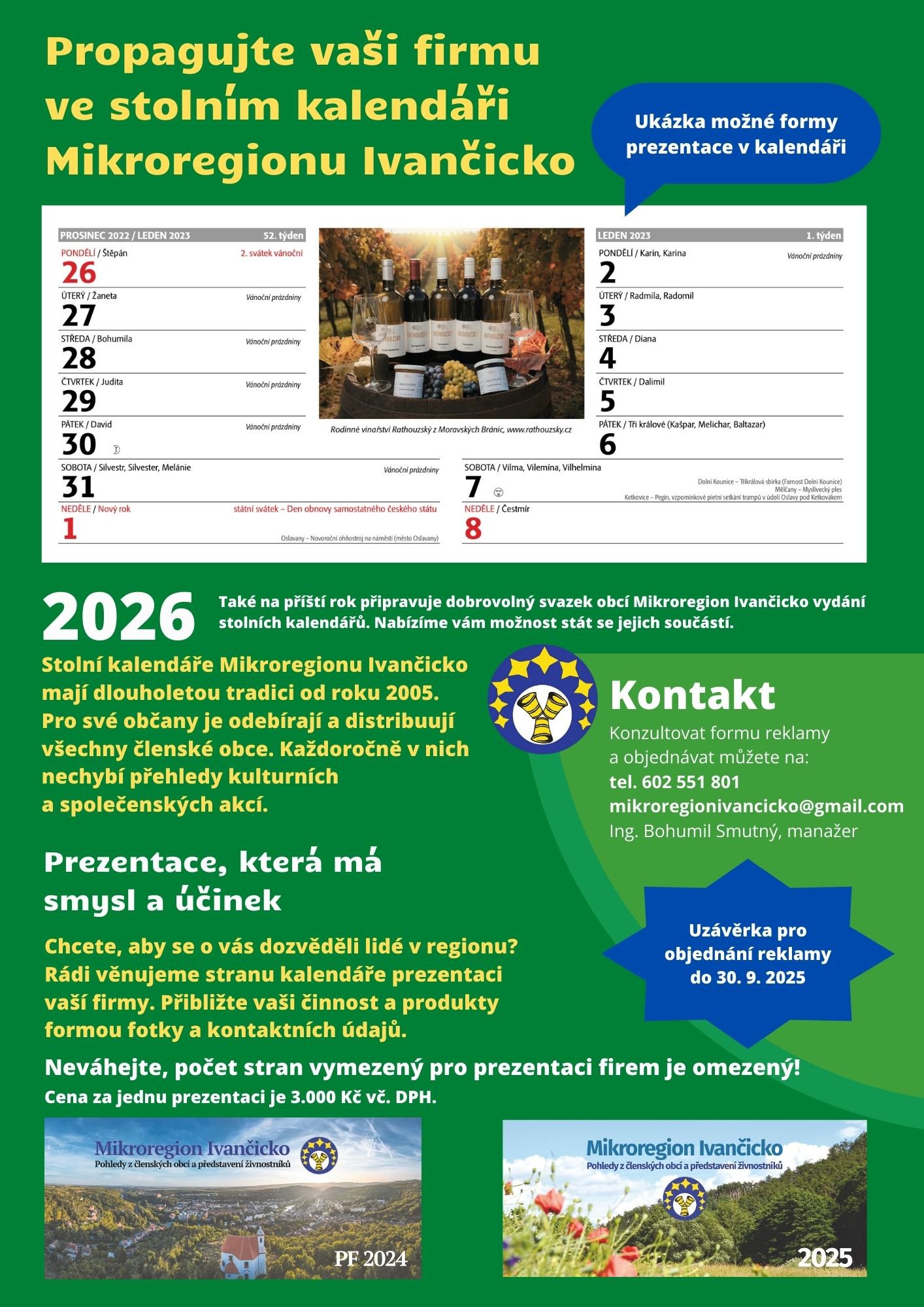 Mikroregion Ivančicko nabízí možnost propagace vaší firmy ve stolních kalendářích na rok 2026. Jedná se o kalendáře, které jsou tradičně distribuovány do obcí v Mikroregionu a informace o vaší firmě se tak dostanou do povědomí lidí v nejbližším okolí.