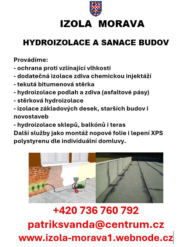 V příloze zveřejňujeme nabídku firmy IZOLA MORAVA, která se zabývá prováděním hydroizolací a sanací budov.