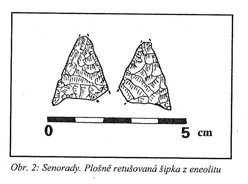 Jedná se o silicitovou šipku která byla nalezena mimo dosud známé neolitické lokality. Jak známo, retušované šipky jsou charakteristické takřka pro celý neolit, zejména pro kulturu se zvoncovitými poháry – KZP, až po starší dobu bronzovou. Jde o povrchový nález bez jakéhokoliv doprovodného materiálu katastru obce Senorady. K nálezu došlo v září roku 1998 jižně od obce, mezi polními tratěmi “Rozběhla“ a „Podhání“, odkud je známo sídliště kultury s lineární a moravskou malovanou keramikou objevené F. Floriánem v 60. letech 20. století (Koštuřík a kol. 1986, 236).
