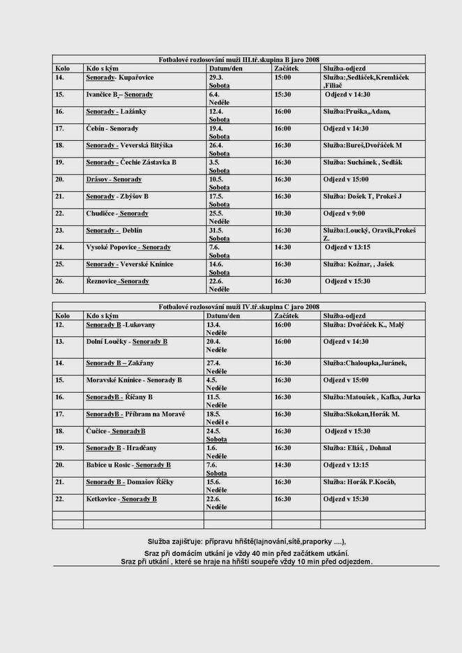 Fotbalové rozlosování muži III.tř.skupina B jaro 2008 a rozlosování muži IV.tř.skupina C jaro 2008.