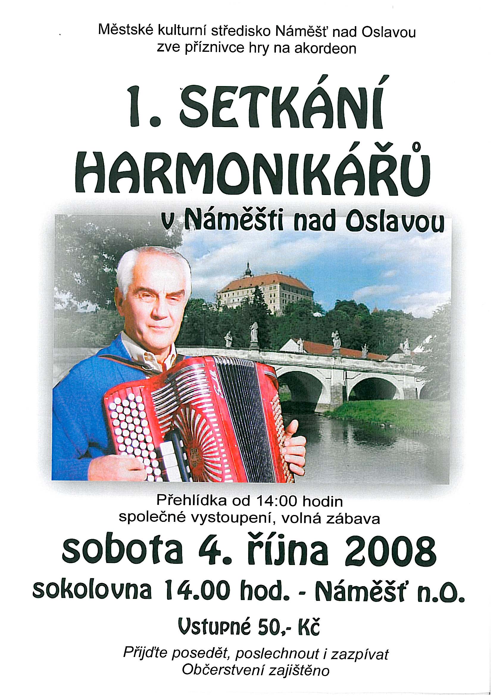 Městské kulturní středisko Náměšť nad Oslavou zve všechny příznivce hry na akrordeon v sobotu 4. října od 14 hod. v sokolovně na 1. setkání harmonikářů. Můžete se těšit na přehlídku soutěžících, společné vystoupení a volnou zábavu. Občerstvení zajištěno. Vstupné je 50,- Kč, předprodej probáhá v Informačním centru na Masarykově nám. 100, Náměšť n.O., tel: 568 620 493.