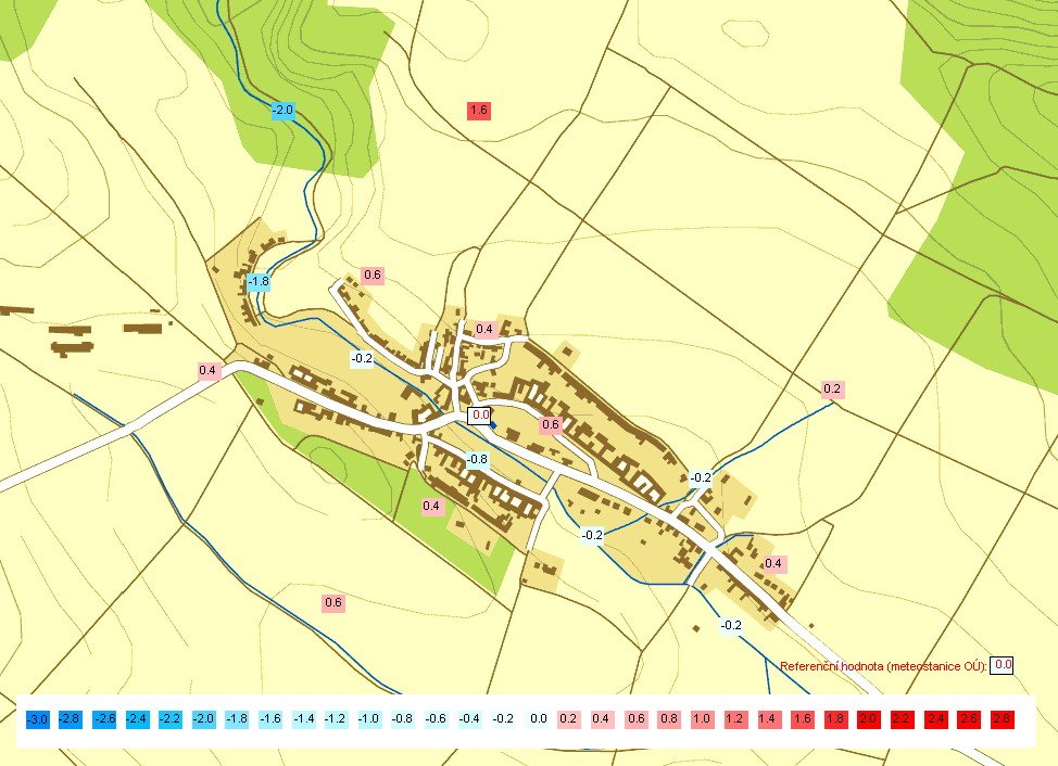 Uvedené teploty jsou relativní, vztahují se k referenčnímu bodu (teplotě u obecního úřadu, přibližně ve středu obce). Tzn. že pokud je na mapce vyznačena teplota -1.0°C, pak je v tomto místě průměrná teplota o jeden stupeň nižší než teplota ve středu obce. Tzn. je-li u obecního úřadu teplota 17°C, pak v uvedeném bodě můžeme očekávat teplotu 16°C.