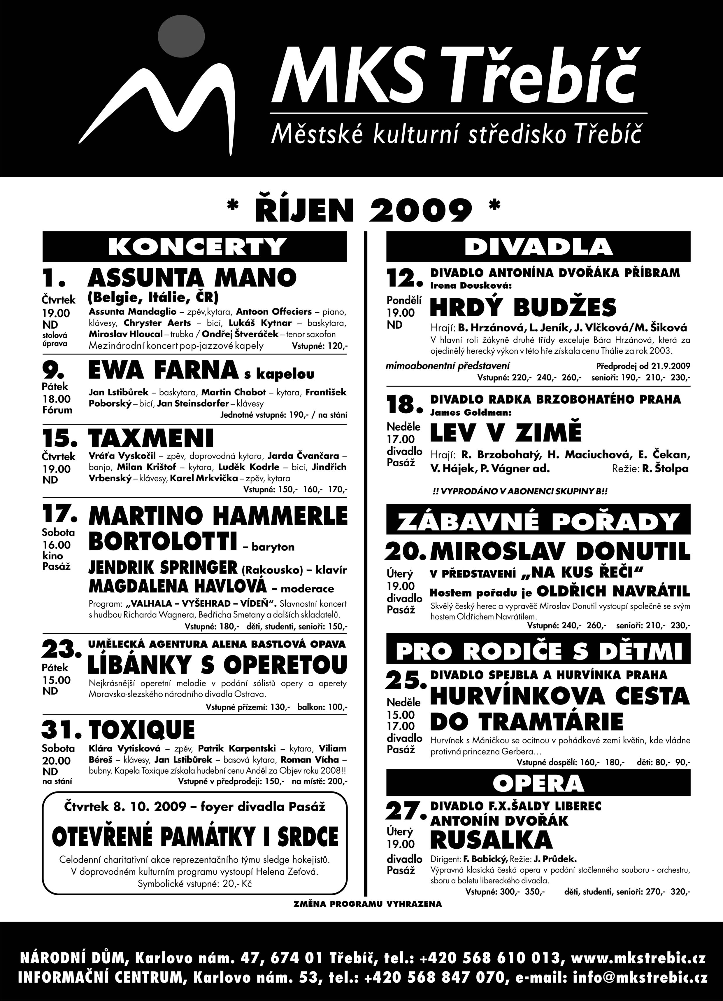 Přehled kulturních akcí, které pořádá Městské kulturní středisko Třebíč v říjnu 2009.