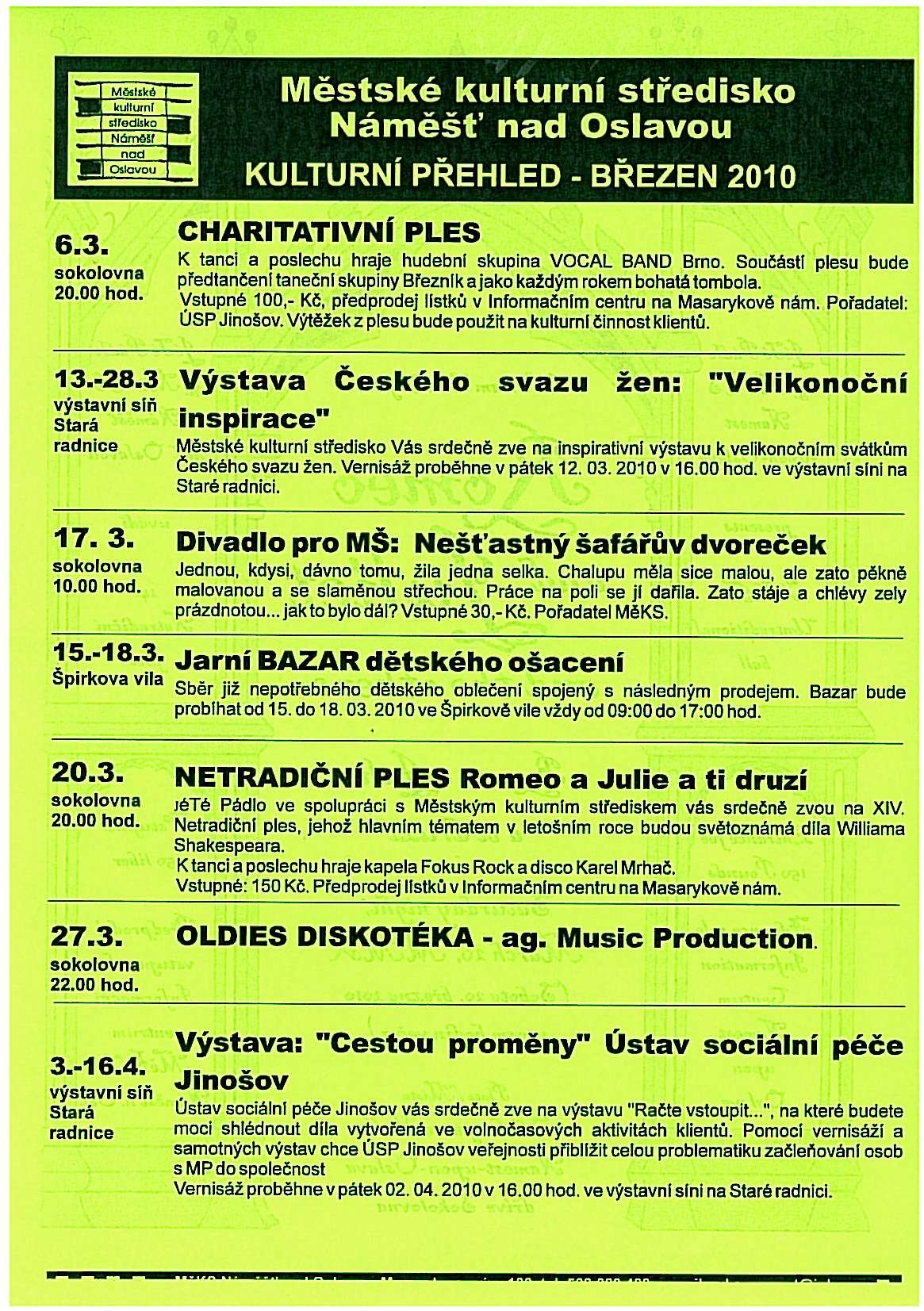 Přehled kulturních akcí konaných v měsíci březnu v Náměšti nad Oslavou.