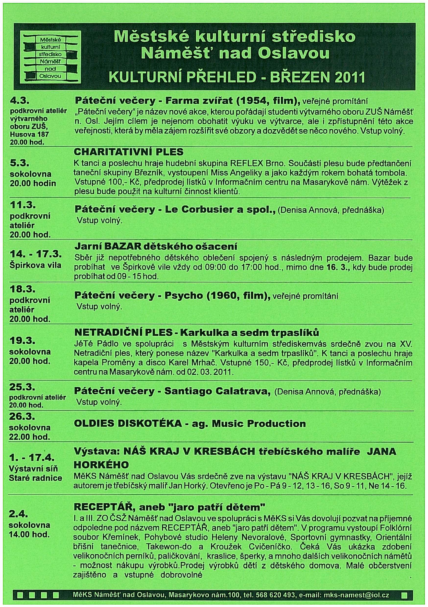 Přehled společenských akcí konaných v Náměšti nad Oslavou v měsíci březnu 2011.