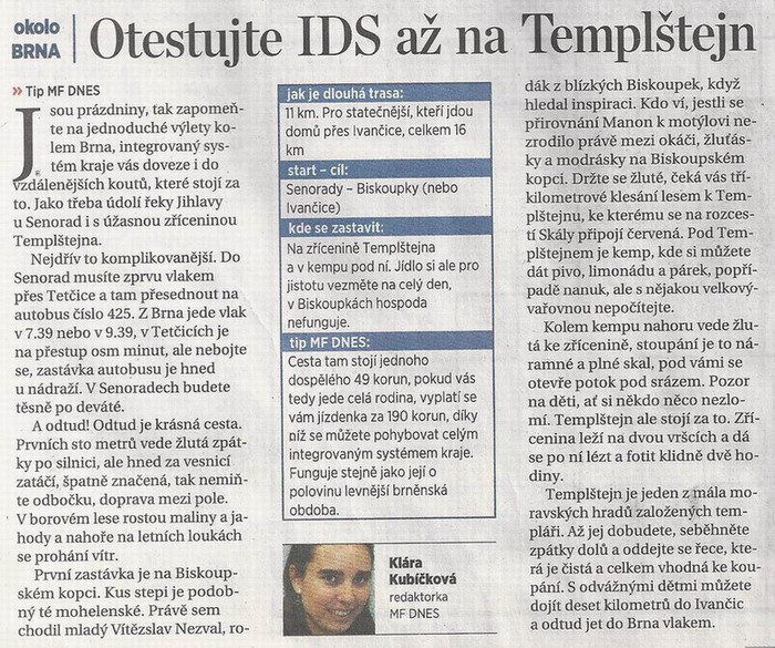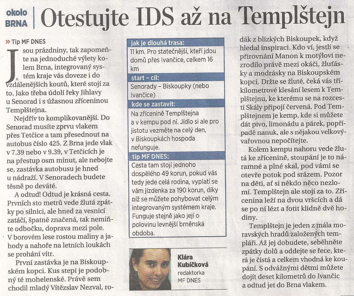 V deníku MF DNES se objevil článek - tip na výlet s IDS na hrad Templštýn.