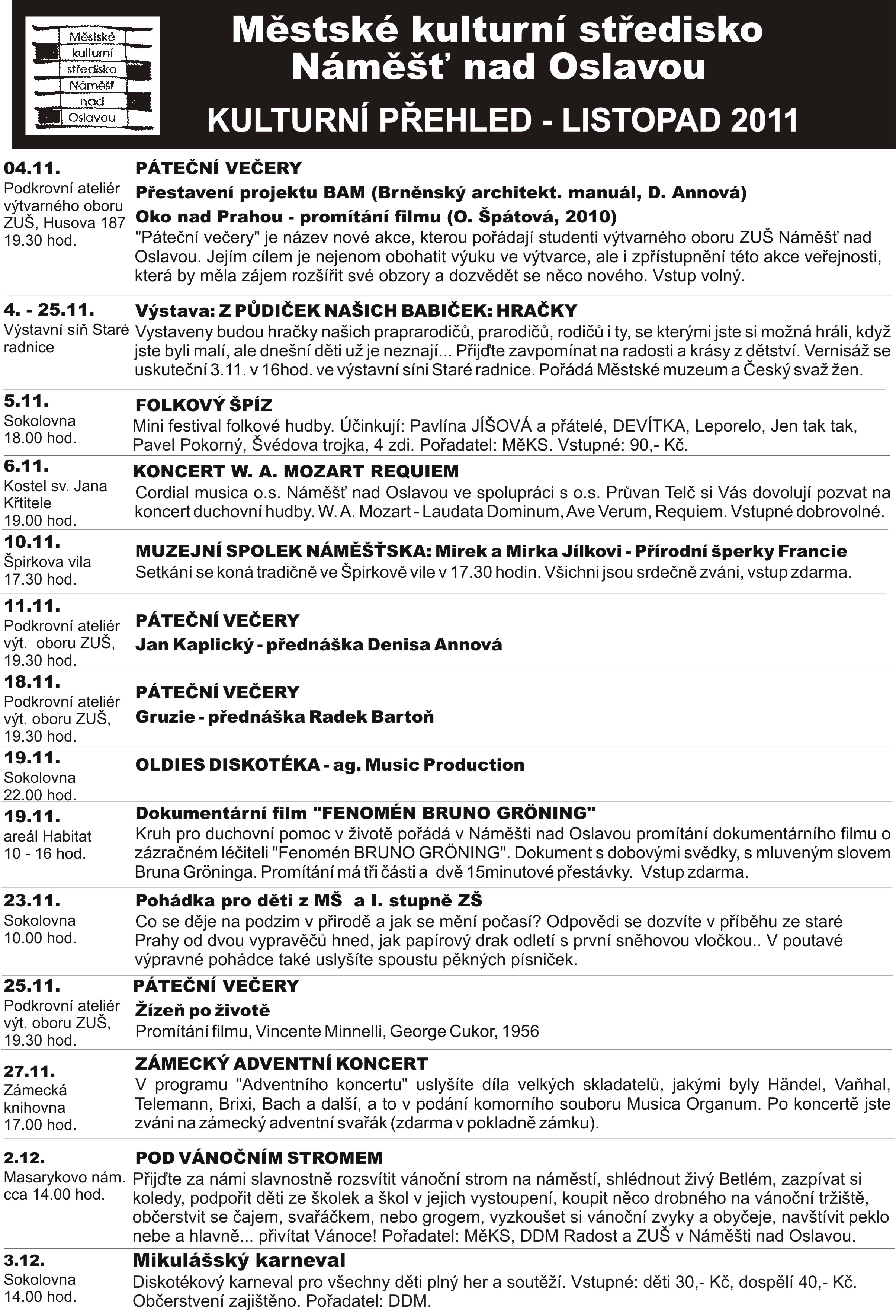 Kulturní přehled na měsíc listopad a plakáty některých akcí.