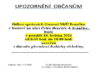 MěÚ Ivančice oznamuje, že v pondělí 18. května 2026 v době od 08.00 hod. do 10.00 hod. bude v souvislosti s plánovaným přerušením dodávky elektrické energie budova Odboru správních činností, ul. P. Bezruče 4, Ivančice uzavřena....