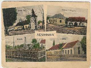 Klasické pohlednice z obce Senorady. Za upozornění stojí pohlednice kolorovaná, na které se nachází ještě oplocený pomník obětem 1.sv. války. Dále na pohlednici vidíme bývalý hostinec pana Matouška, bývalou školu (dnešní hasičskou zbrojnici) a náves se starou hospodou a kapličkou. Na pohlednici „Pozdrav ze Senohrad“ mimo školy a hospody pana Matouška vidíme ještě zříceninu hradu Levnov (Ke...