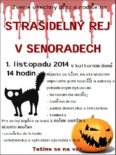 Srdečně zveme rodiče a děti na Strašidelný rej v Senoradech, který se uskuteční 1. listopadu od 14:00 hod. v kulturním domě v Senoradech. Děti i rodiče mohou, ale nemusí dorazit v kostýmech....