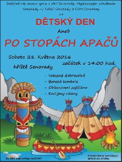 Srdečně vás zveme na DĚTSKÝ DEN aneb PO STOPÁCH APAČŮ, který se uskuteční 28.května 2016, začátek od 14:00 hod hřiště Senorady. ...