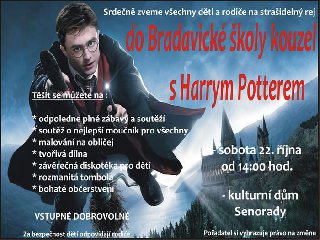 Srdečně zveme všechny děti a rodiče na strašidelný rej DO BRADAVICKÉ SKOLY KOUZEL S HARRYM POTTEREM Sobota 22. října 2016 od 14:00 hod v kulturním domě Senorady. Těšit se můžete na: - odpoledne plné zábavy a soutěží, - soutěž o nejlepší moučník pro všechny, - malování na obličej, - tvořivá dílna, - závěrečná diskotéka pro děti, - rozmanitá tombola, - bohaté občerstvení, VSTUPNÉ J...