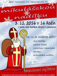 Jako každý rok i letos naší obec navštíví mikuláš se svojí družinou :), současně bude i rozsvícen vánoční stromeček. Kdy: 3.12.2016, od 16:00hod, Kde: Senorady, vedle hasičky, Všichni jsou srdečně zváni....