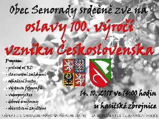 Obec Senorady srdečně zve na oslavy 100. výročí vzniku Československa Program: - průvod od KD - slavnostní zahájení - odhalení busty - výstava fotografií - video-projekce - dobové uniformy - občerstvení zajištěno 14. 10. 2018 ve 14:00 hodin u hasičské zbrojnice...