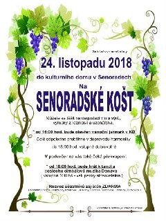 Srdečně vás všechny zveme na Senoradké košt, který se koná v sobotu 24. listopadu 2018 od 16:00 hod. v kulturním domě v Senoradech. Těšit se můžete na vánoční jarmark, degustaci vín, sýry, výrobky z řeznictví a uzenářství, odpoledne doprovázené harmonikou. Od 18:00 hod. bude hrát k tanci a poslechu cimbálová muzika. Čeká na vás také překvapení. Autobus na rozvoz zajištěn....
