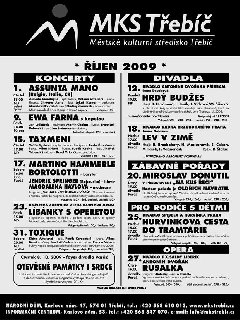Přehled kulturních akcí, které pořádá Městské kulturní středisko Třebíč v říjnu 2009. Malovaný dům - programové oddělení Karlovo nám.53 674 01 Třebíč tel: +420 568 610 025 gsm: +420 775 707 504 e-mail: e.mala@mkstrebic.cz www.mkstrebic.cz ...
